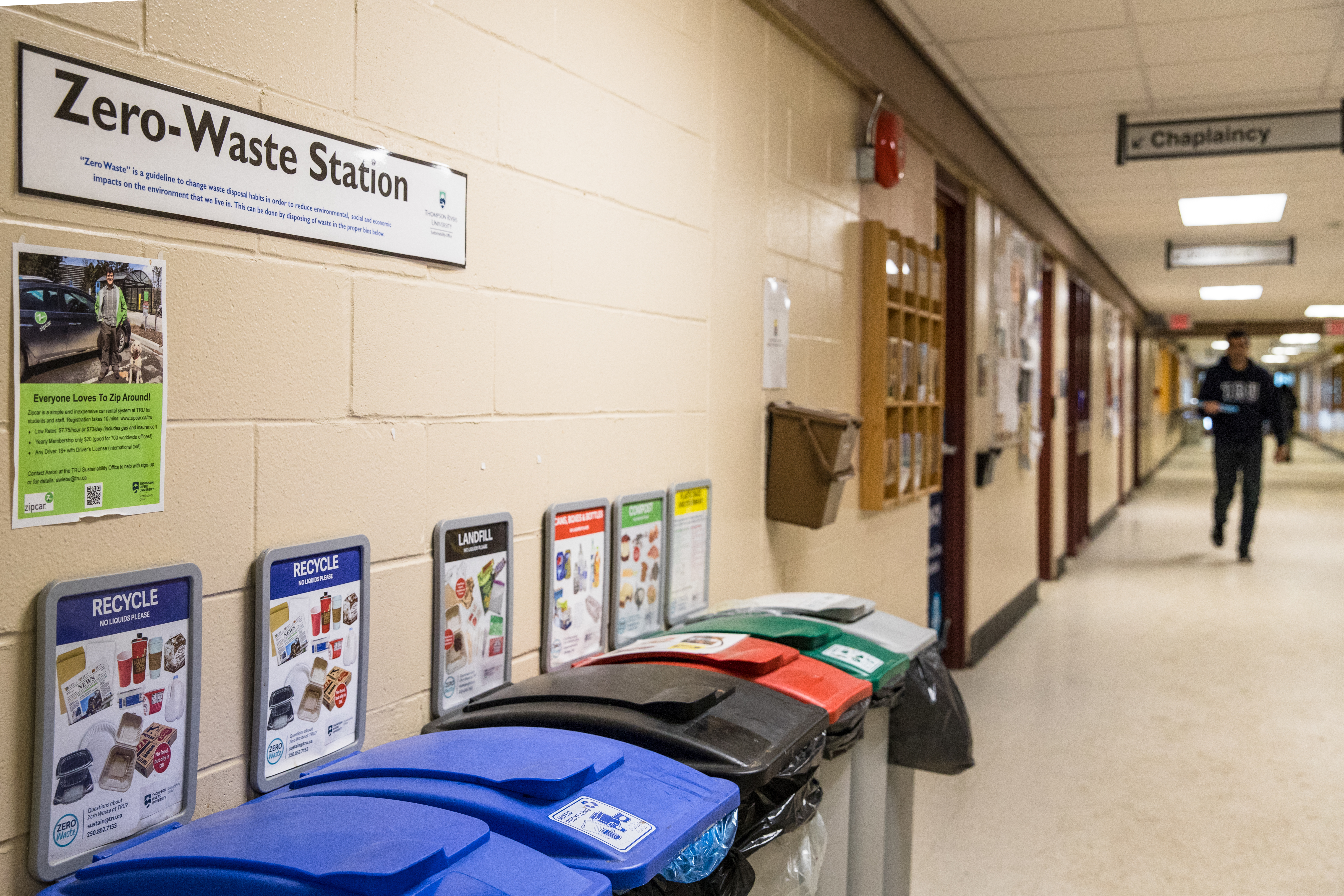 The Sustainability Office on campus builds eco-awareness and involves faculty and students in the goal of becoming more sustainable as an institution and as individuals. Zero waste stations can be found in all campus buildings and on the campus grounds that includes different bins for plastics, paper, compost, and garbage.